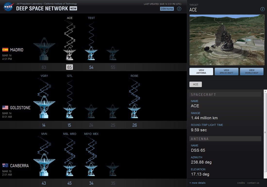 NASA’s long-running DSN Now website provided a graphical presentation of activities at the DSN’s three sites in Australia, California and Spain. The site provided realtime information about what antennas at each site were transmitting to or receiving data from missions across the solar system, illustrating the level of activity of the network and sometimes providing insights about the status of missions before formal announcements.